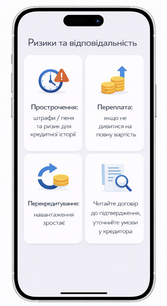 - Прострочка: штрафи/пеня та погіршення кредитної історії.
