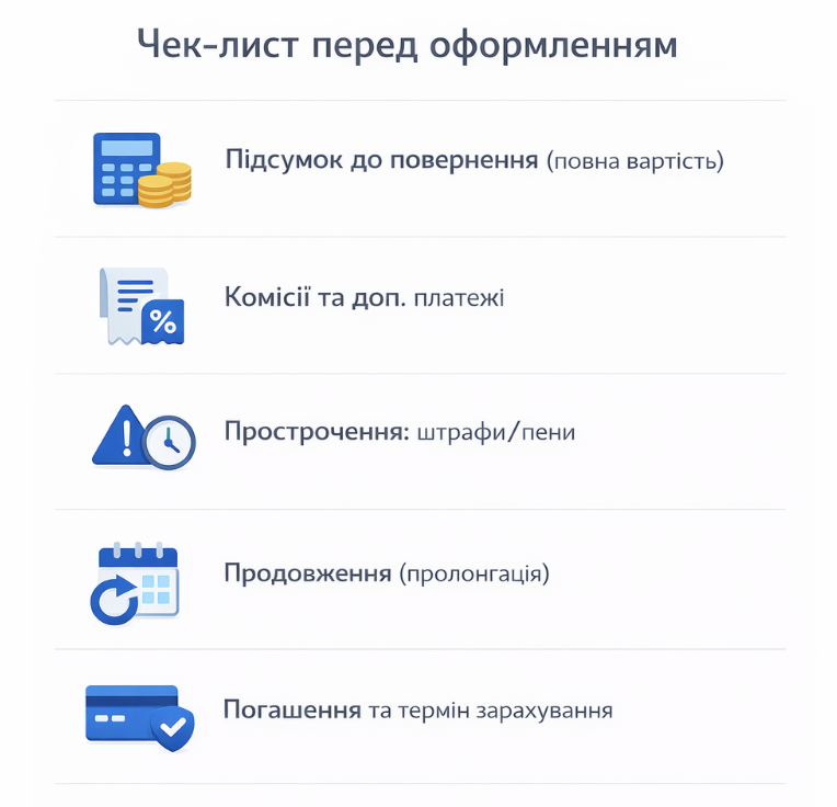 - Підсумок до повернення: перевіряйте розрахунок повної вартості на сайті кредитора та в договорі.